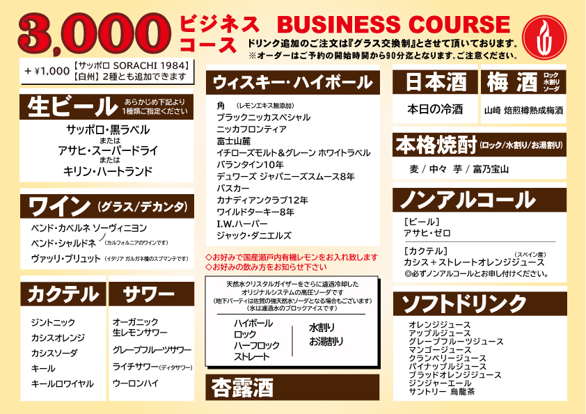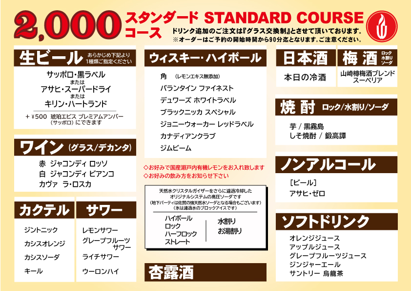※2時間制となりなります。※5,500円コース~は2時間半制(ドリンクは開始からオーダーストップまで2時間)となります