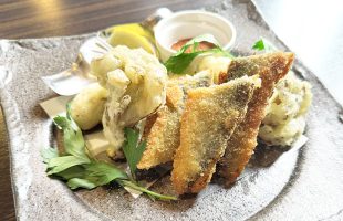 北海道産のサンマに有機パン粉、レーズンを入れてはさみ揚げに。…