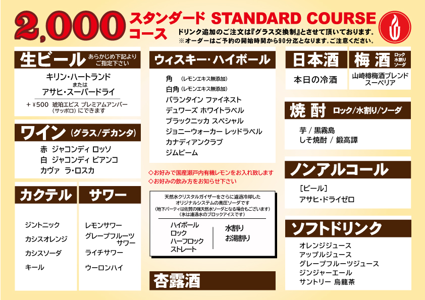 ※2時間制となりなります。※6,500円コース~は2時間半制(ドリンクは開始からオーダーストップまで2時間)となります